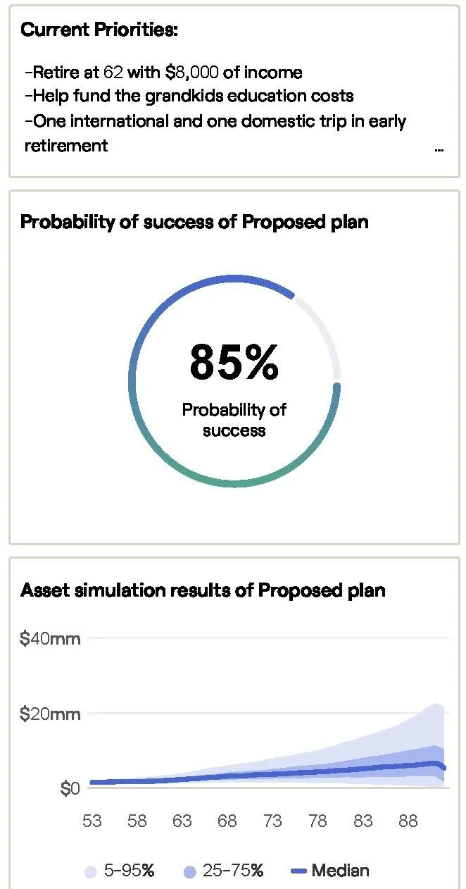 The second meeting primarily consists of reviewing a financial plan, specifically tailored to your goals. This may include a retirement analysis, portfolio allocation review, tax strategies, or other agenda items based on your situation. Each topic will also include clear action items to help reach your goals.